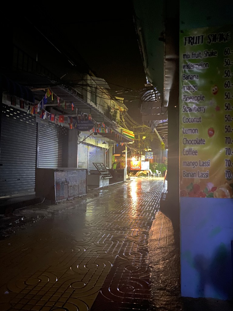 As our ferry pulled into the vicinity of Phi Phi we were immediately blown away by its beauty. And then it started pissing it down. And I mean really pissing it down! We pulled on our rain macs, stuffed our bags in their rain covers, and jumped off the boat, heading straight for our accommodation. Even with the rain hammering it down, we were in awe of what the island was like. A yellow brick road lines the main strip of Phi Phi where you can find rows of shops, restaurants, and bars, all sat neatly between the pier and the main beach on the island.